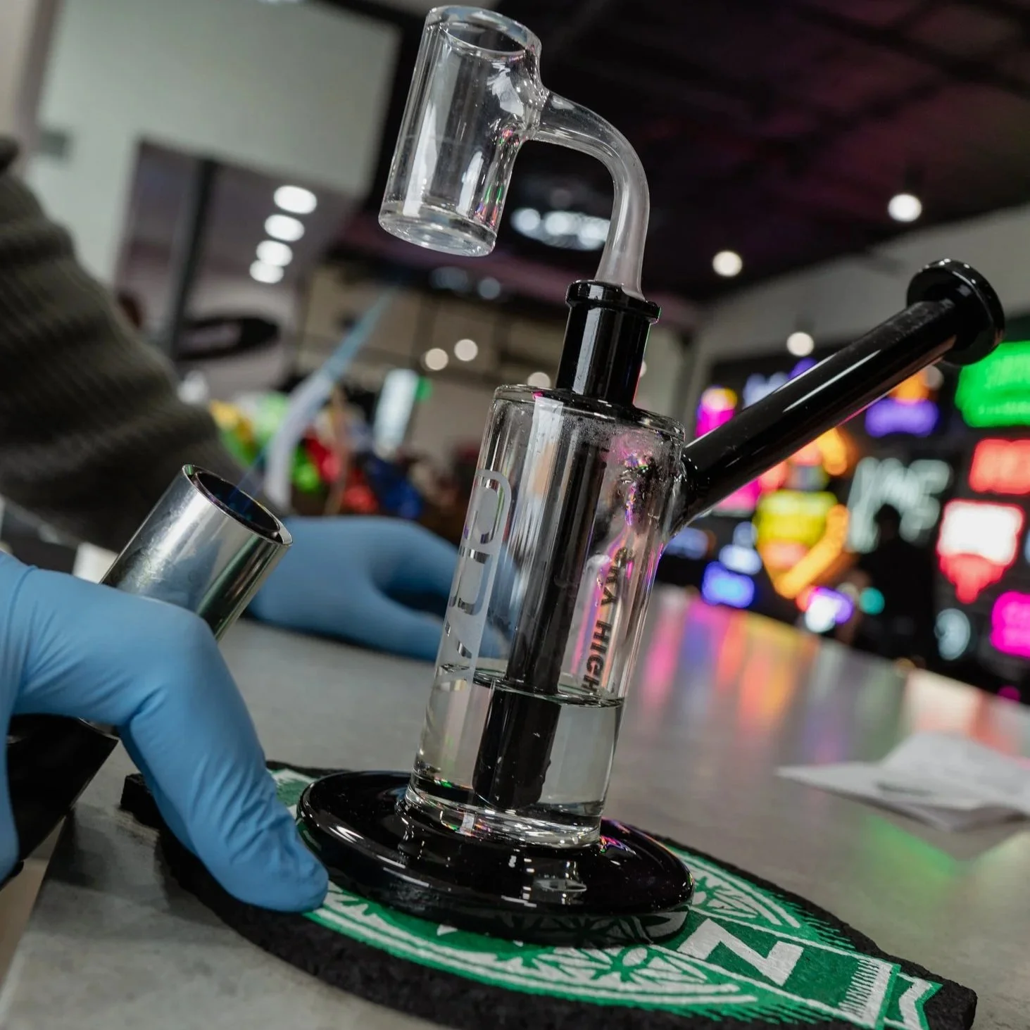 Glass dab rig prepared by a gloved staff member at Sky High Lounge, showcasing a guided dab experience in a modern cannabis lounge.